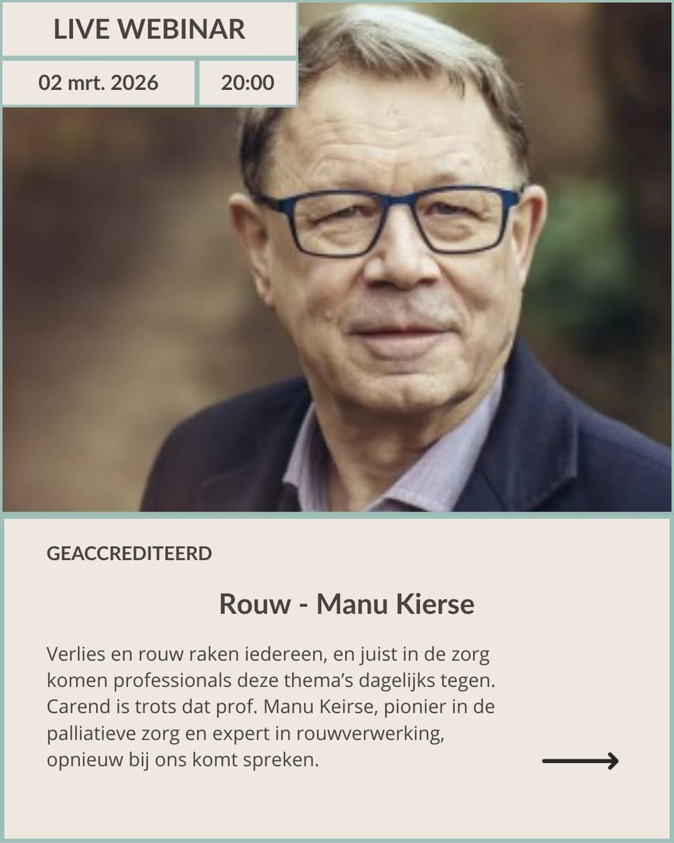 Op maandagavond 2 maart organiseert Carend een bijzonder webinar met Manu Keirse, dé rouwexpert van de Lage Landen. In dit webinar neemt hij je mee in een warme en heldere kijk op rouw en levend verlies - voor iedereen die zelf rouw draagt, én voor wie anderen nabij wil zijn.
