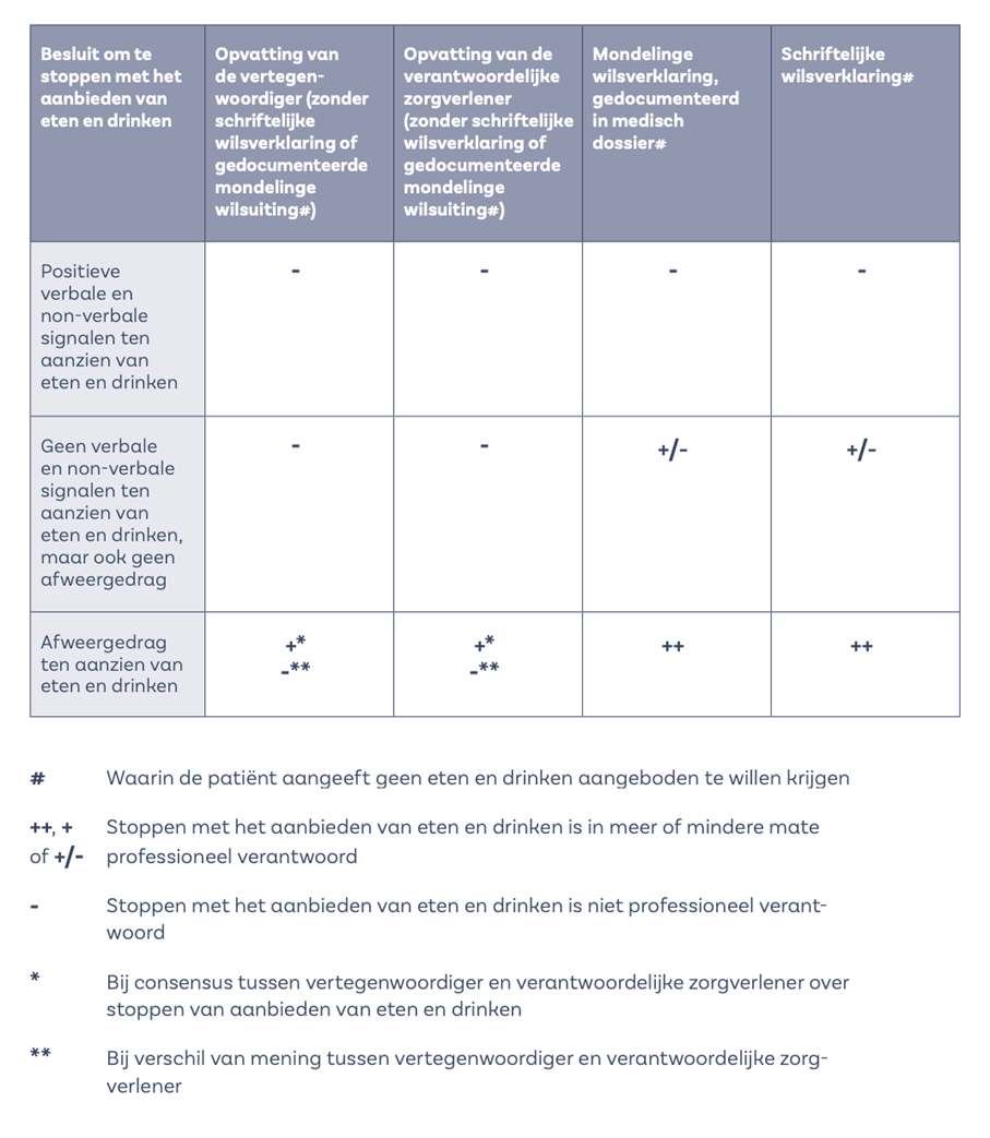 Deze vragen komen ook terug in Deel 3 (p. 128) van de in 2024 herziene Handreiking Zorg voor mensen die bewust afzien van eten en drinken om het levenseinde te bespoedigen van KNMG en V&VN. Hierin wordt expliciet stilgestaan bij het stoppen met het aanbieden van eten en drinken bij wilsonbekwame mensen met dementie. De handreiking bespreekt onder meer het verloop, de te verwachten symptomen en passende zorg. Hoewel vooral bedoeld voor hulpverleners, is de handreiking ook toegankelijk voor naasten.