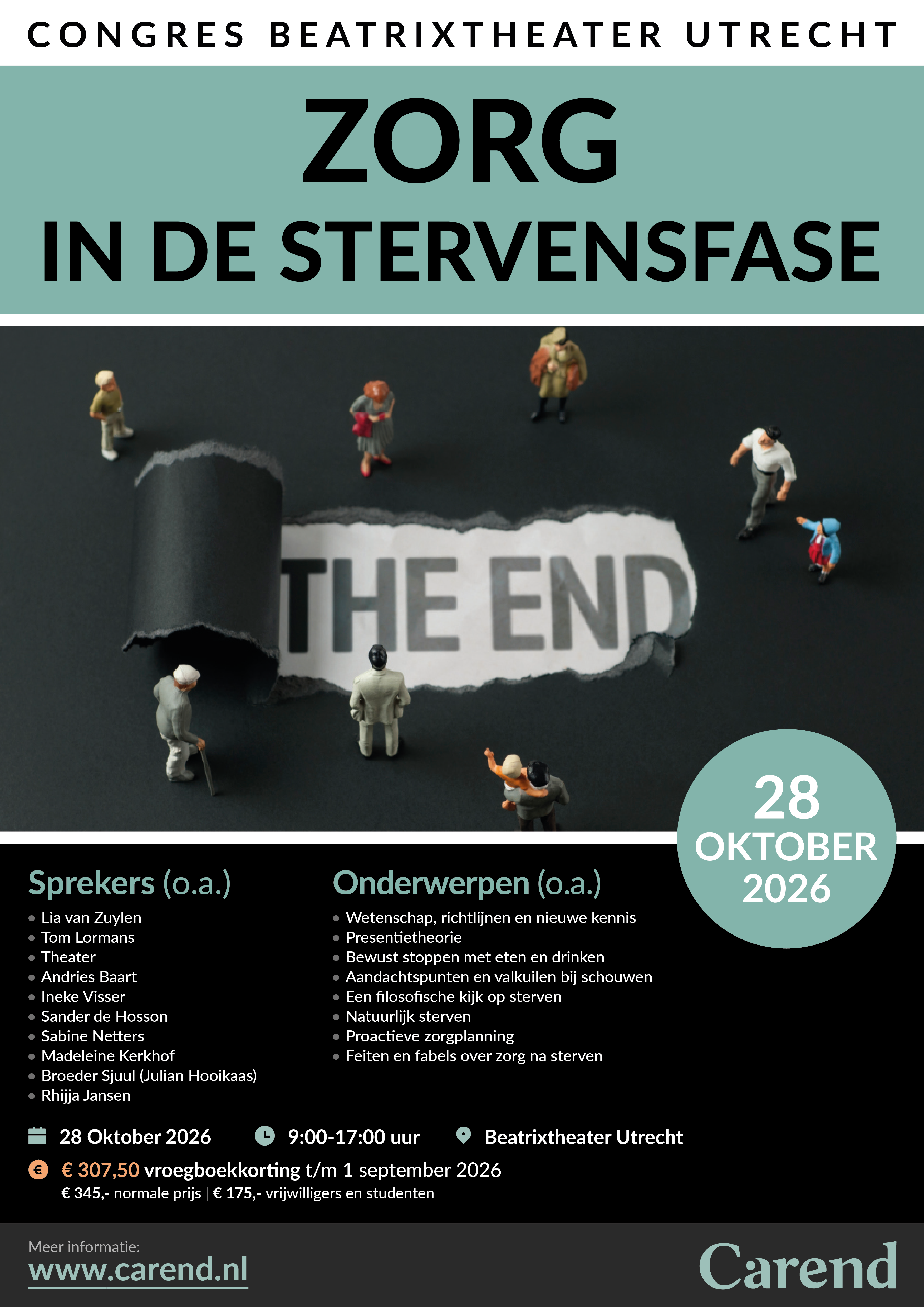 Prof. dr. Andries Baart, grondlegger van de presentietheorie, spreekt over een professionele houding die niet draait om ingrijpen of oplossen, maar om trouw zijn aan de ander. Om nabijheid die niet verdwijnt wanneer het moeilijk wordt. Om aandacht die blijft, ook wanneer er niets meer te veranderen valt. Zijn plenaire lezing nodigt uit tot een diepe reflectie op stervenszorg: wat vraagt deze fase van ons als mens, niet alleen als zorgverlener? Hoe blijven we aanwezig in verdriet, angst en stilte? En hoe bewaren we menselijkheid in een tijd waarin zorg steeds sneller, technischer en meer protocolgestuurd lijkt te worden?