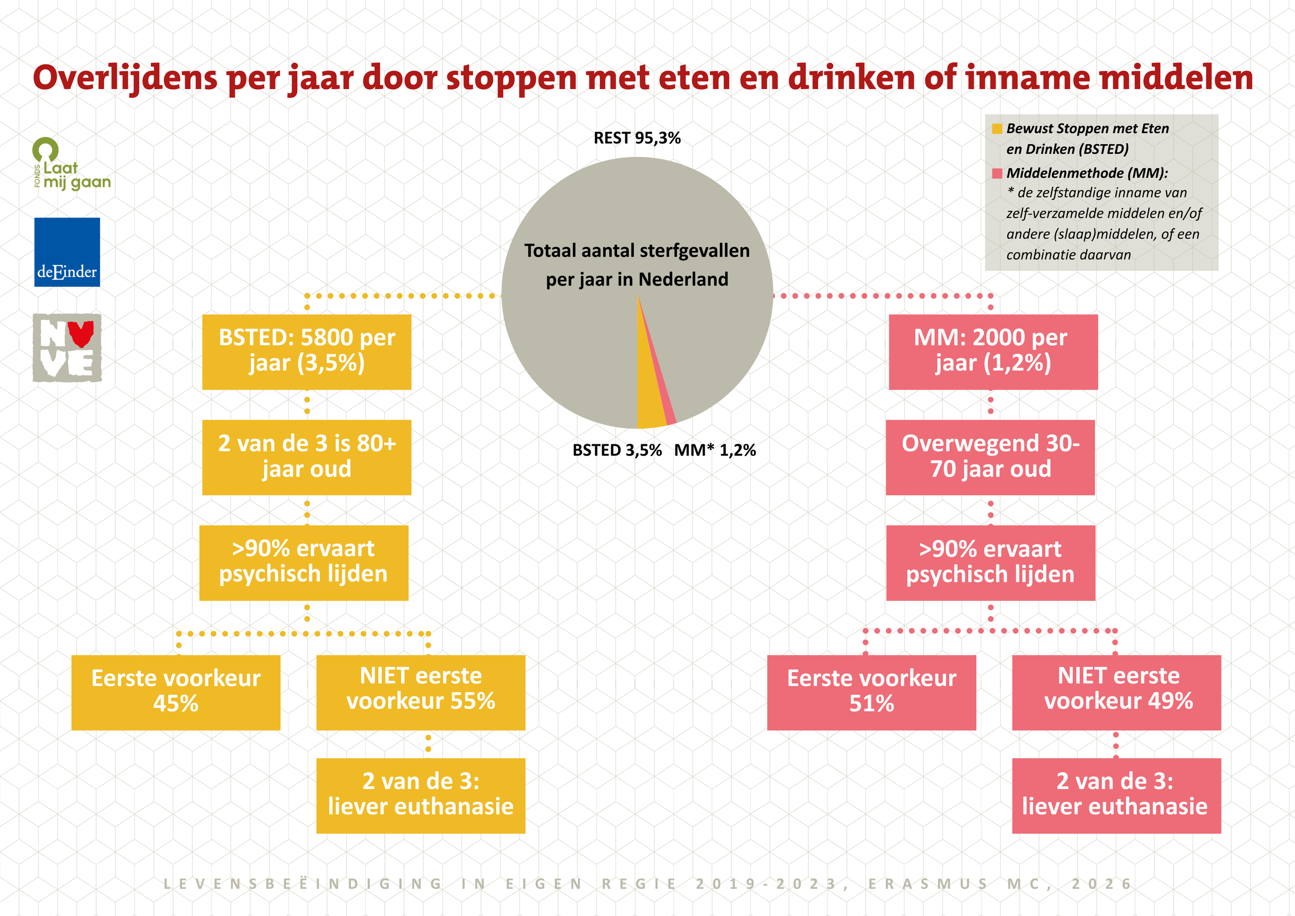 Uit een recente replicatiestudie van onderzoekers van het Erasmus MC laat zien dat het aandeel overlijdens na bewust stoppen met eten en drinken (BSTED) in Nederland is toegenomen. In de onderzochte periode 2019–2023 steeg het percentage van 2,1 naar 3,5 procent van alle overlijdens.