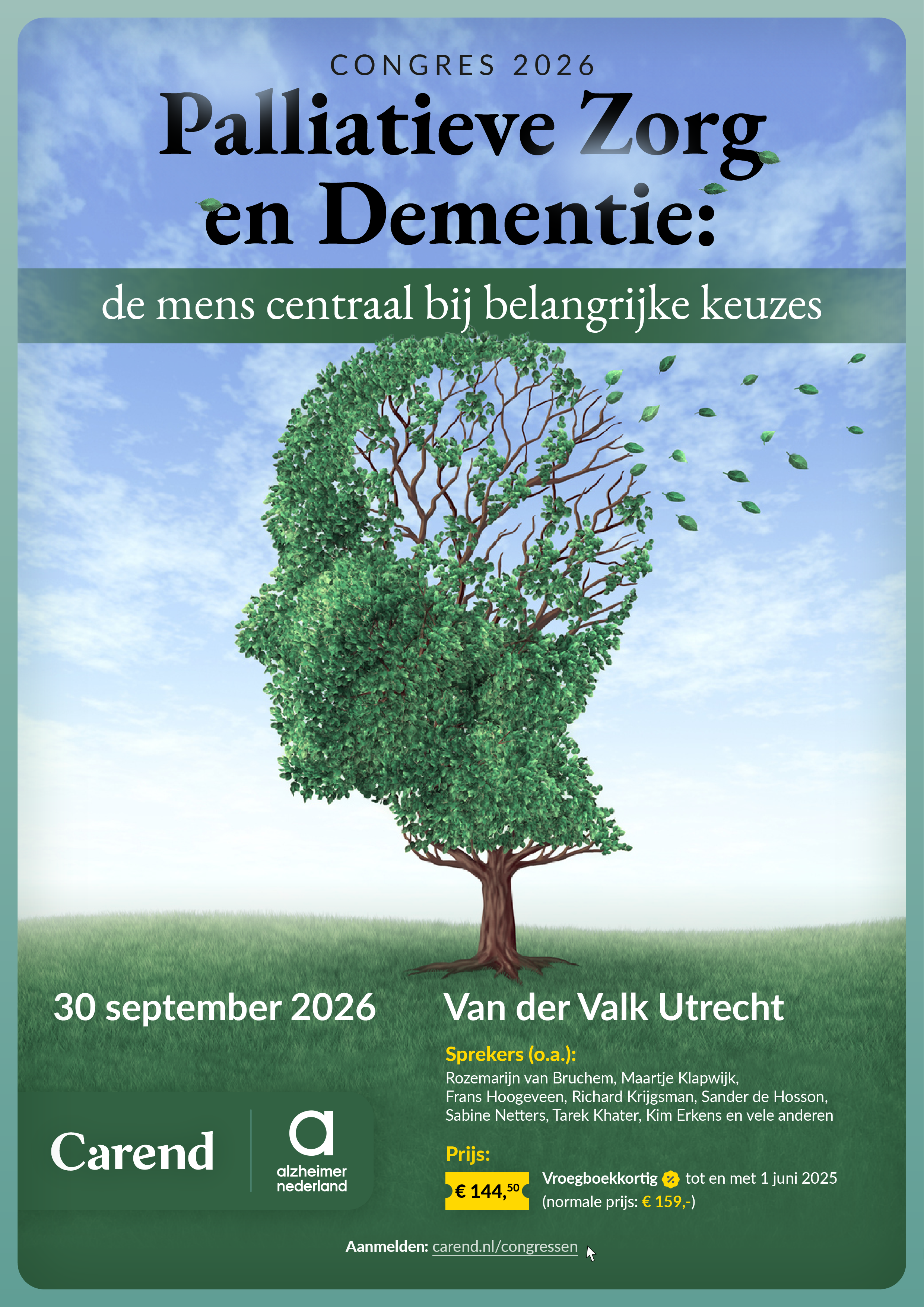 Carend en Alzheimer Nederland zijn er trots op om samen weer het Congres over Dementie en Palliatieve Zorg te organiseren na het succesvolle congres van vorig jaar. Het vindt plaats op 30 september 2026 in Van der Valk Utrecht van 13.00 - 17.45 uur.