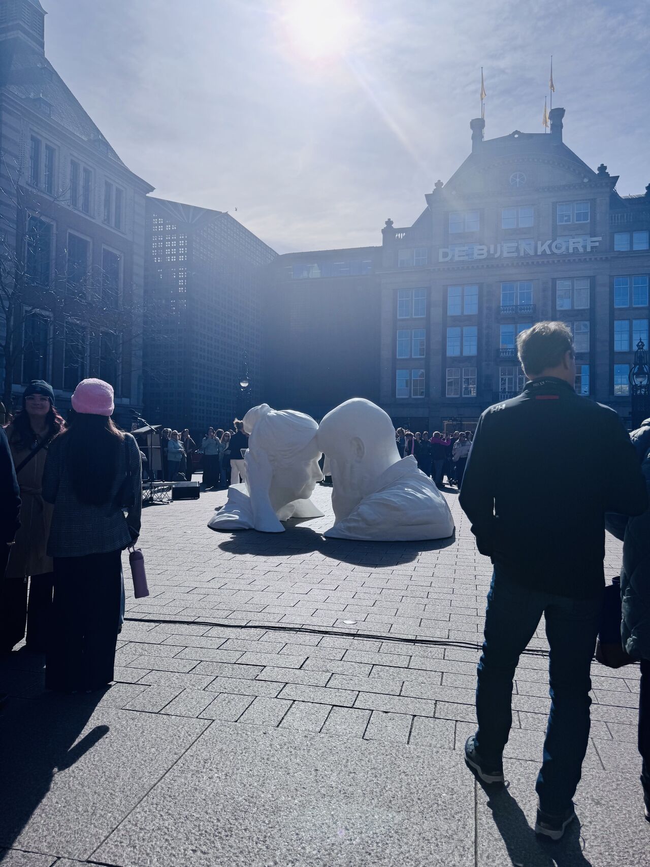 Twee gigantische witte hoofden die elkaar in de ogen kijken: een tijdelijk kunstwerk op het Beursplein in Amsterdam heeft als doel aandacht te vragen voor de zorg voor mensen met een ongeneeslijke ziekte.