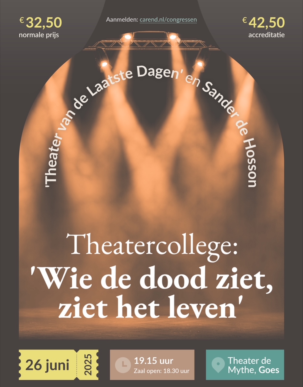 Carend nodigt je uit voor een uniek theatercollege met Sander de Hosson, longarts en expert in de palliatieve zorg, en een ontroerende voorstelling van Theater van de Laatste Dagen. Een avond vol échte verhalen en onvergetelijke ervaringen, met zowel een lach als een traan. Inschrijven kan via deze site. De avond wordt georganiseerd in samenwerking met het Palliatief Netwerk Zeeland. De avond vindt plaats op 26 juni 2025 in het theater 'De Mythe' in Goes.