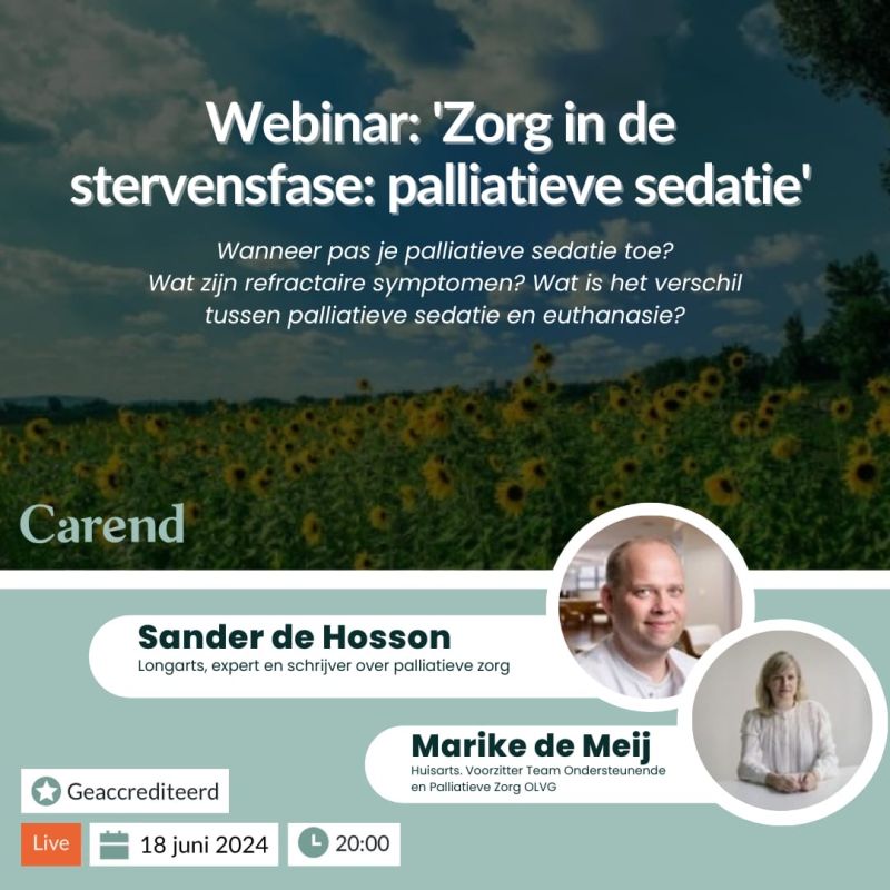 Wil jij je medische kennis inzetten om duizenden zorgprofessionals te bereiken—en vind je online leren leuk? Sluit je aan bij het webinarteam van Carend, hét platform voor palliatieve zorg, opgericht door longarts Sander de Hosson en internist-oncoloog Sabine Netters.